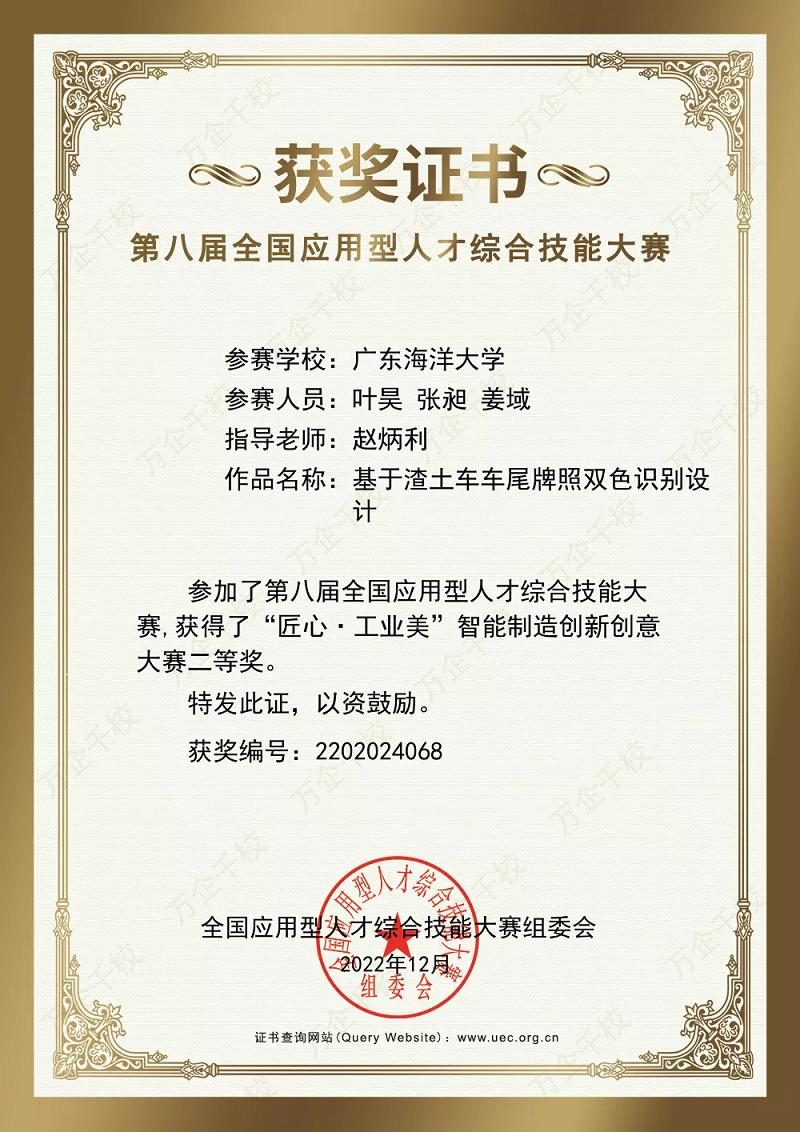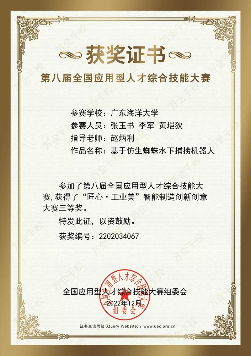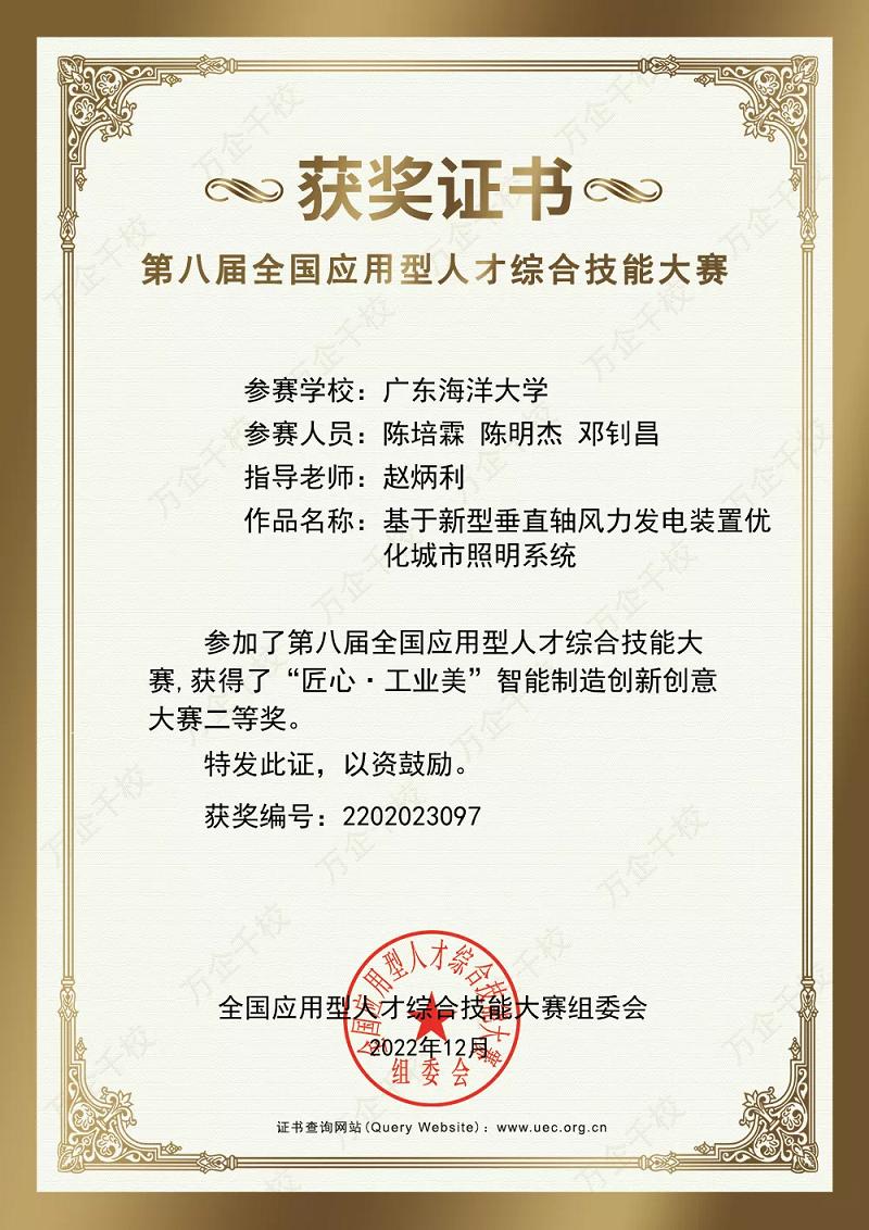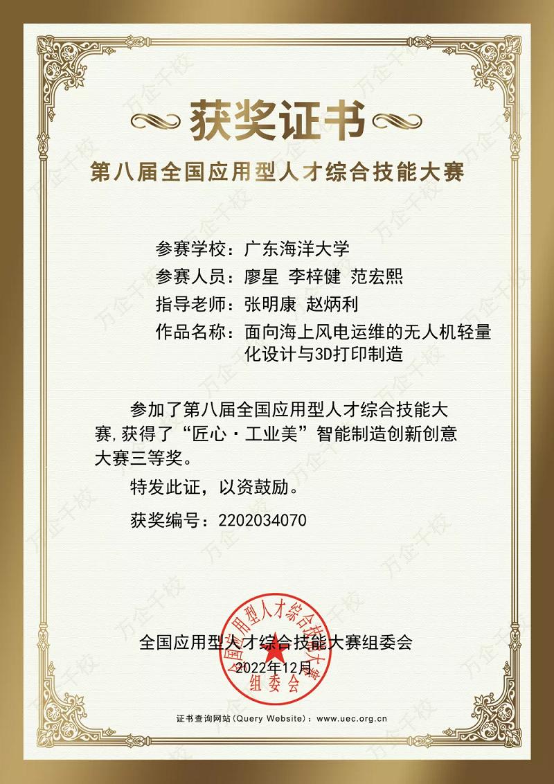 其中参赛学子叶昊、张昶、姜域的《基于渣土车车尾牌照双色识别设计》和参赛学子陈培霖、陈明杰、邓钊昌的《基于新型垂直轴风力发电装置优化城市照明系统》获得了“匠心·工业美”智能制造创新创意大赛二等奖。参赛学子张玉书、李军、黄垲狄的《基于仿生蜘蛛水下捕捞机器人》、参赛学子廖星、李梓健、范宏熙的《面向海上风电运维的无人机轻量化设计与3D打印制造》和参赛学子李宇昊、邓铭坚、罗德柱的《基于人工智能技术视觉识别的无人机云台》获得了“匠心·工业美”智能制造创新创意大赛三等奖。