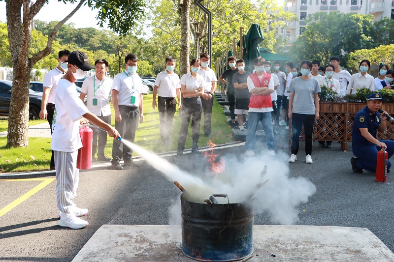 韦智锋在点评时指出,整个疏散方案合理,过程紧张有序,疏散演练的效果显著。他现场开展了消火栓和灭火器操作相关知识讲解与示范,并指导同学们使用灭火器进行灭火。