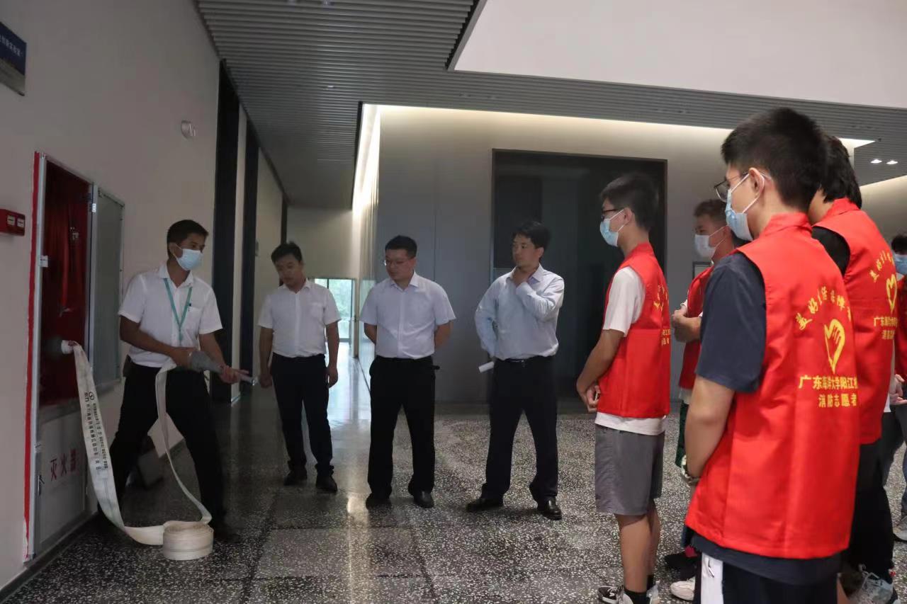 在海纳楼,安保队长冯子均给大家介绍了全校消防预警、消防警报及防火系统,工程主管潘洪辉实际操作了校园防火卷帘的使用操作。