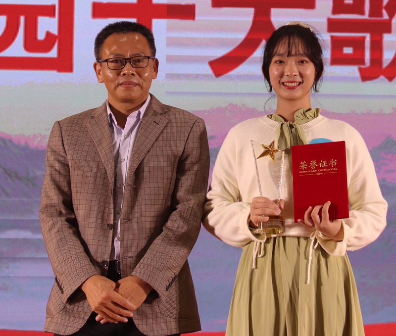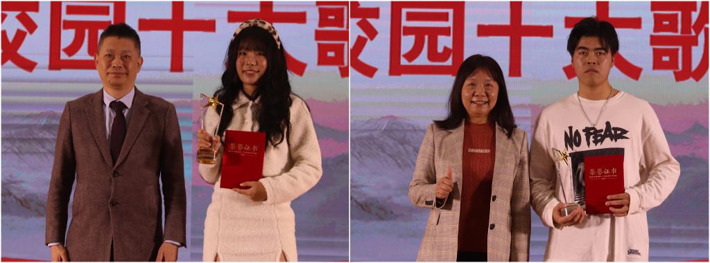 最终,来自商学院王晴同学的《我是一只小小鸟》,征服评委,荣获冠军;来自商学院樊蓉同学荣获亚军,材料科学与工程学院梁超同学荣获季军;陈嘉全、叶涵、吴建杰、冯京艳、谢天源、黄慧琳、秦俊杰分别获得第4-10名;王晴荣获“最佳人气奖”,黄慧琳荣获“最具台风奖”。参加活动的领导嘉宾为获奖个人进行颁奖。比赛在全场合唱《我和我的祖国》中圆满结束。