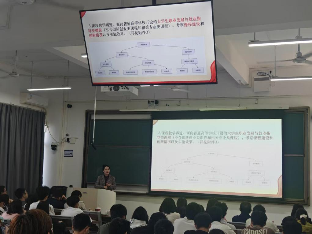 分享会上,刘爽老师结合自身丰富的指导经验,首先系统梳理了历年全国大学生职业规划大赛的整体参赛态势及各赛道核心数据,以详实的数据支撑帮助师生建立对赛事的宏观认知。随后,她围绕赛事规则、评审标准及参赛注意事项展开细致解读,通过“政策解读+案例分析”的方式,将抽象的评分维度转化为具体可感的备赛方向。