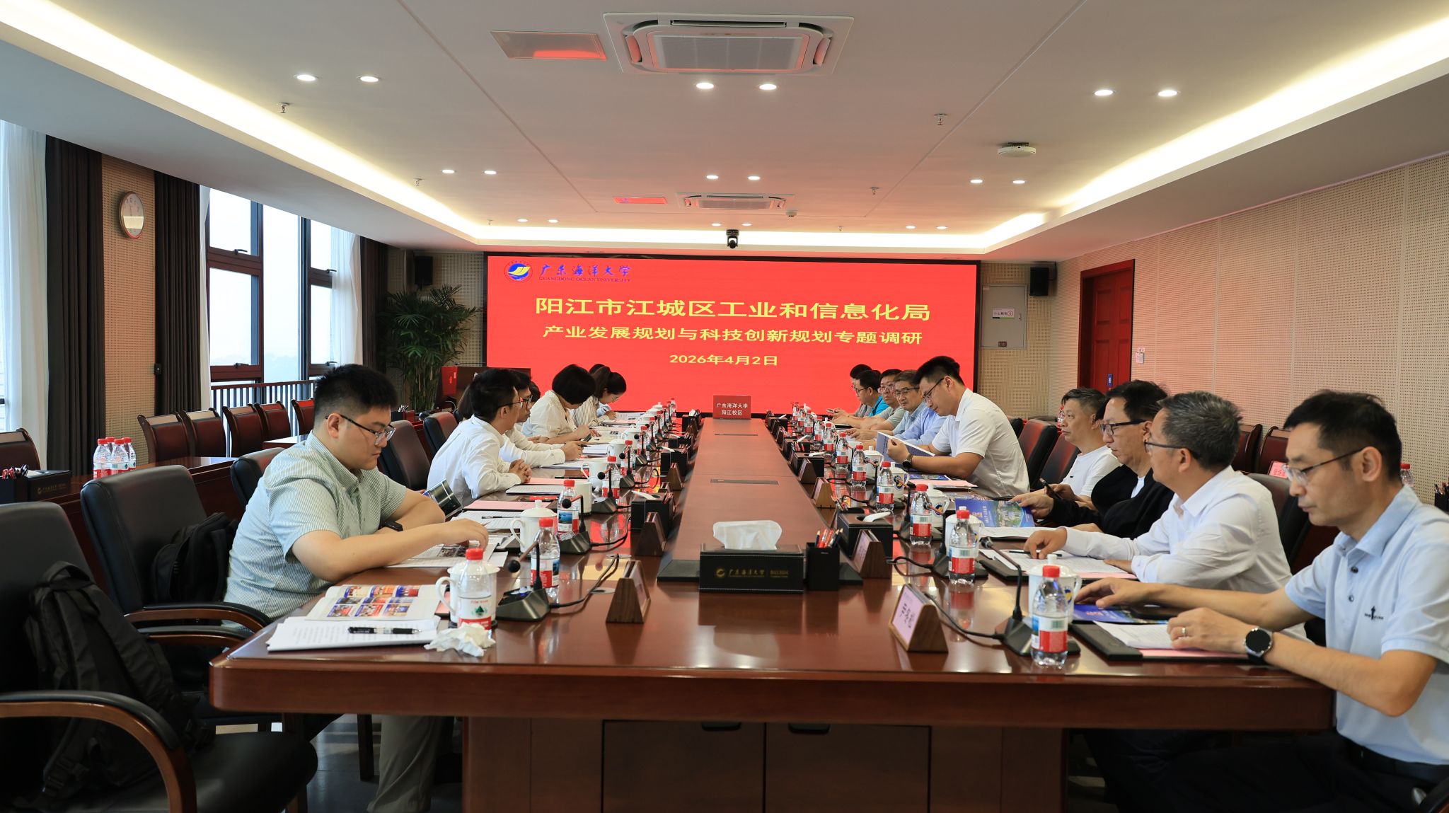 4月2日,阳江市江城区工业和信息化局局长程国就率工信局相关领导及广东省国际工程咨询有限公司专家一行,到阳江校区开展产业发展与科技创新专题调研。校区党委委员、管理办公室副主任、教学科研部部长白浚宇,各学院负责人及相关人员参加调研活动。
