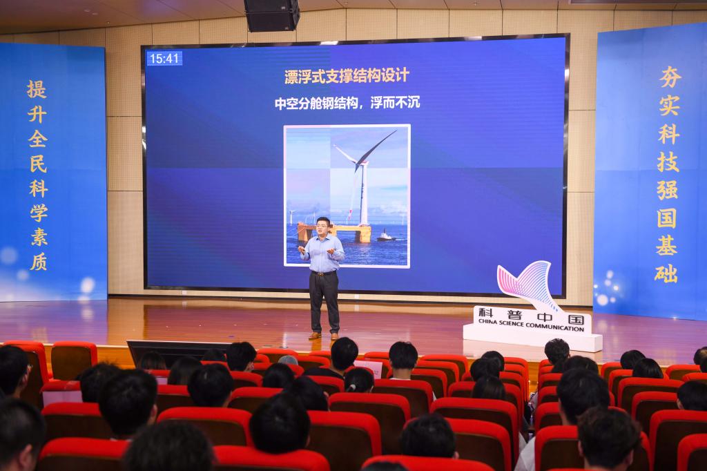 近年来,阳江因地制宜发挥海洋优势,建设“蓝色粮仓”,加快推进海洋经济高质量发展。本次活动还同步开展了“科普中国说”广东阳江专场活动,邀请专家聚焦海上风电与海洋牧场开展专题科普演讲,介绍相关领域的科研进展。华南理工大学船舶与海洋工程系主任、教授樊天慧在“驭风驭海,智创未来”的演讲中表示,深远海开发是海上风电的趋势,漂浮式风电技术是海上风电的“皇冠”。他介绍了海上风电“电力快递链”,讲解了漂浮式风电技术突破与锚泊系统优化,展现海洋科技助力绿色生活。随着人工智能技术的迅猛发展,船舶与海洋工程装备的制造和运维过程都逐渐智能化。中山大学海洋工程与技术学院副院长、教授谢鹏以“打造智能小船,启航逐梦深蓝”为题,展示了如何制作一款智能化海洋航行器模型,讲授了智能化海洋装备知识及研究进展。