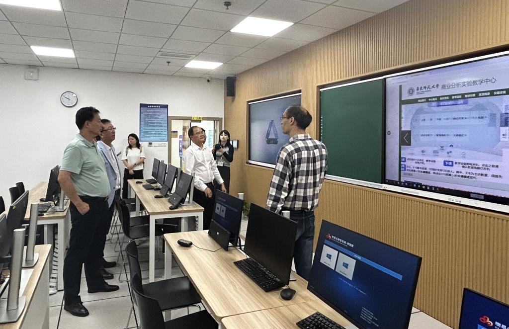 14日上午,调研组一行参观了华东师范大学经济与管理学院陈彪如学术成就陈列室和商业分析实验教学中心。华东师范大学经济与管理学院副院长杨勇、华东师范大学教授冯学钢、华东师范大学商业分析实验教学中心副主任姚占雷陪同参观。在交流座谈会上,杨勇、冯学钢教授先后介绍了经济与管理学院的学科专业建设的发展情况,回顾了学院实验教学中心的建设历程。姚占雷分享了商业分析实验教学中心的建设经验与远景规划。周昌仕充分肯定了华东师范大学商业分析实验教学中心的建设经验对推动今年会官网数字经济与产业发展研究中心建设的学习借鉴意义,指出两校在学科建设、人才培养和师资培养等方面拓展交流的重要性。双方还就党建引领、实验室建设、实验教学课程改革、数据资源与管理、数字化实验教学场景建设等问题展开了研讨交流。