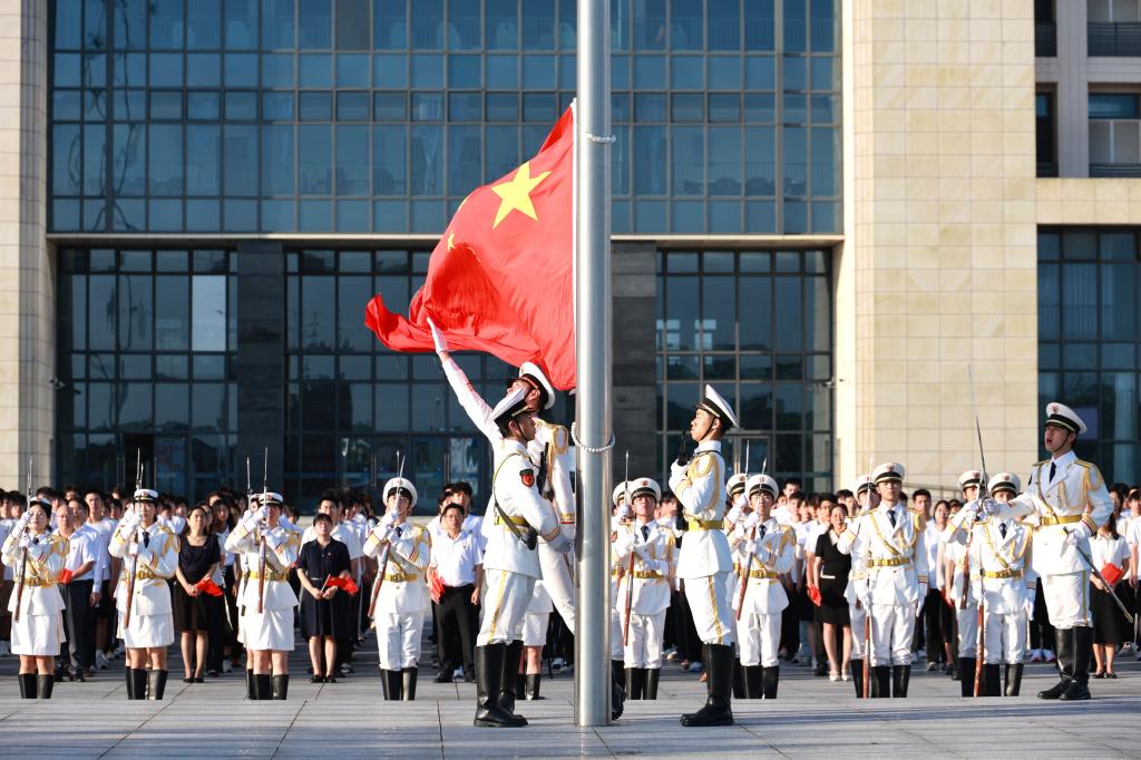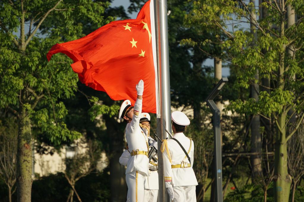 7时整,升旗仪式正式开始。国旗护卫队员迈着整齐的步伐,护送五星红旗入场。伴随着慷慨激昂的《义勇军进行曲》,旗手振臂一挥,五星红旗冉冉升起,师生齐唱中华人民共和国国歌,向五星红旗行注目礼。随后,在丁永成的带领下,全体党员面向党旗,重温入党誓词,表达对党的崇高信仰以及为党的事业奋斗终生的坚定决心。