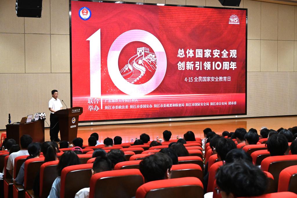 4月10日下午,校区联合阳江市委政法委、市委国安办、市委机要和保密局、市国家安全局、市公安局、团市委等多个部门在海纳楼113报告厅举办了“4·15”全民国家安全教育日活动。阳江校区党委副书记丁永成主持活动。市委机要和保密局局长谭羡、副局长李孟基、邱华基,市国家安全局相关支队领导,市公安局支队长申鸿鹏,副支队长李儒侠、黄元锋,大队长陈一玲,各学院党总支书记以及校区全体辅导员和学生代表共500多人参加。