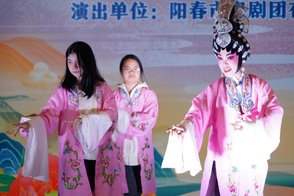 晚会在戏曲《阳江粤韵飞扬》的精彩演出中拉开帷幕,展现了阳江独特的秀丽景色和风土人情。随后上演的粤剧《花好月圆》讲述了秀才柳毅与龙女三娘的爱情故事。折子戏《李逵探母》,节选自中国四大名著之一《水浒传》,展现了感人的母子情,传颂了中华传统孝义美德。新编精品折子戏《三打白骨精》,用戏曲形式再现了《西游记》的经典章节,情节跌宕起伏,令观众赞叹连连。在戏曲老师与学生的互动学习环节,8名男生和8名女生跟随戏曲演员们学习了文武生和花旦表演姿态,让同学们近距离感受了戏曲的美妙。
