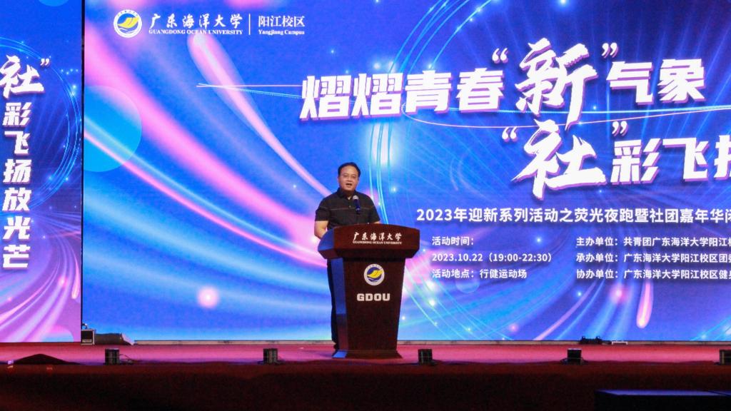 10月22日,由阳江校区团委主办,校区团委社团部承办的“熠熠青春‘新’气象,‘社’彩飞扬放光芒”为主题的荧光夜跑暨第三届社团嘉年华闭幕式晚会在行健运动场举行,校区1000余名师生积极参与其中。阳江校区党委委员、管委会副主任陈永强,阳江校区学生事务部部长邓朝晖出席并领跑本次荧光夜跑活动。