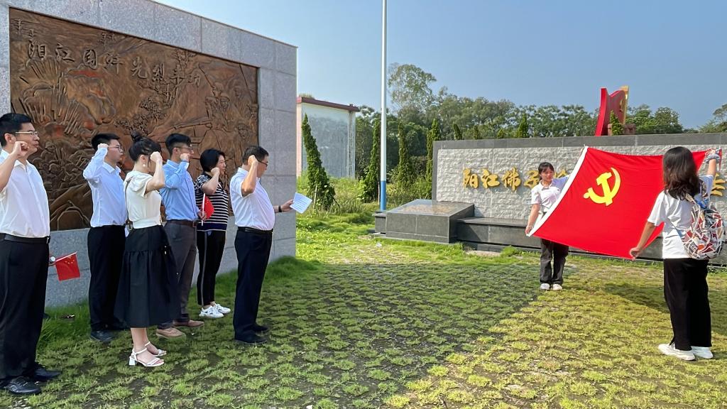 在阳江围歼站革命烈士纪念碑,全体同志共同回顾围歼战的激烈战斗,在思想上受到革命的洗礼。唐志军带领大家重温入党誓词。随后,全体人员来到阳江烈士陵园缅怀革命先烈的丰功伟绩。最后,大家参观了那蓬村关山月故居和疍场村农会旧址。