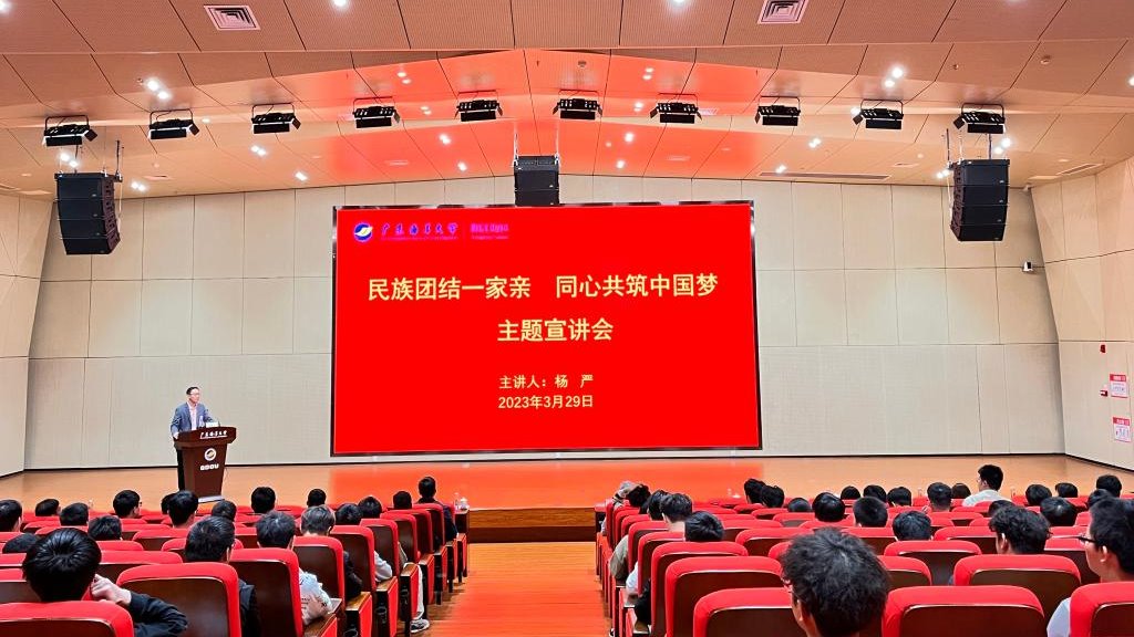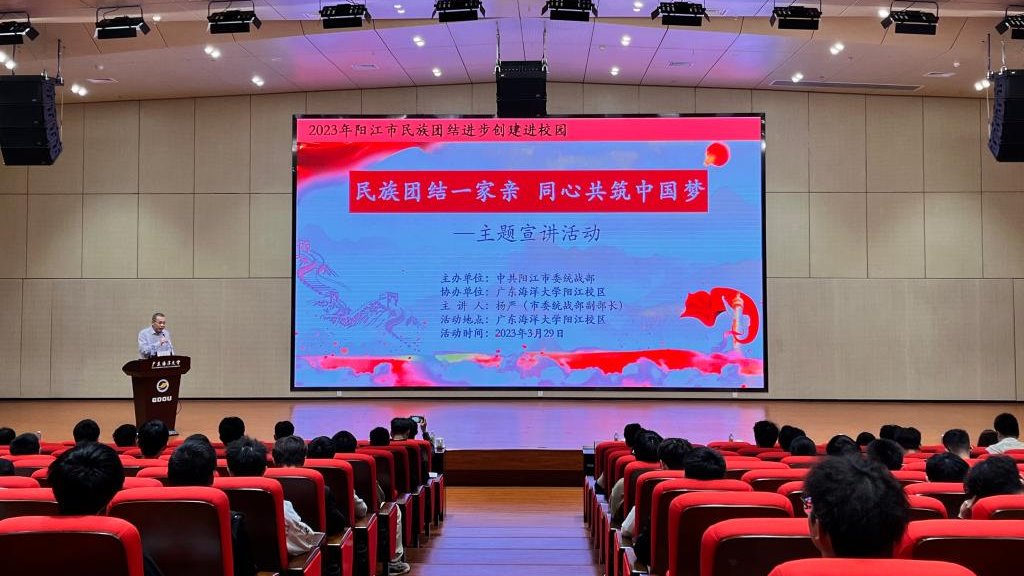 为铸牢师生中华民族共同体意识,增强民族凝聚力和向心力,3月29日下午,校区在海纳楼113报告厅组织开展“民族团结一家亲•同心共筑中国梦”主题宣讲会。校区管委会委员、组织人事部负责人李鹏虹主持,阳江市委统战部副部长杨严主讲,校区师生代表150多人参会。