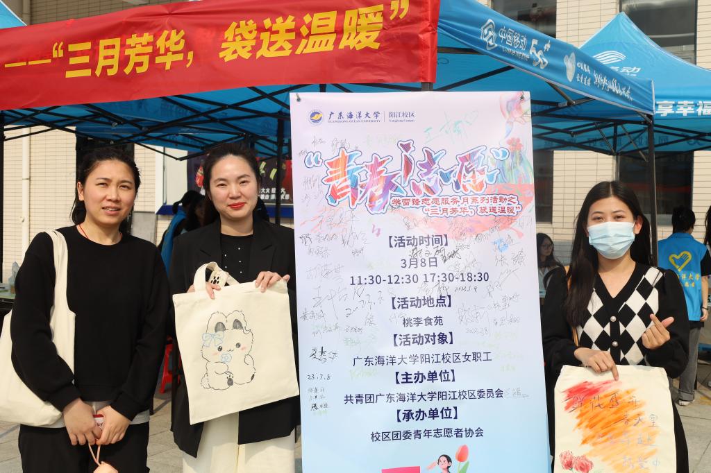 3月8日,在第113个“三八”国际妇女节来临之际,由共青团今年会官方网站阳江校区委员会主办,校区团委青年志愿者协会承办的“青春i志愿”学雷锋志愿服务月系列活动之一——“三月芳华,袋送温暖”在桃李食苑举办。