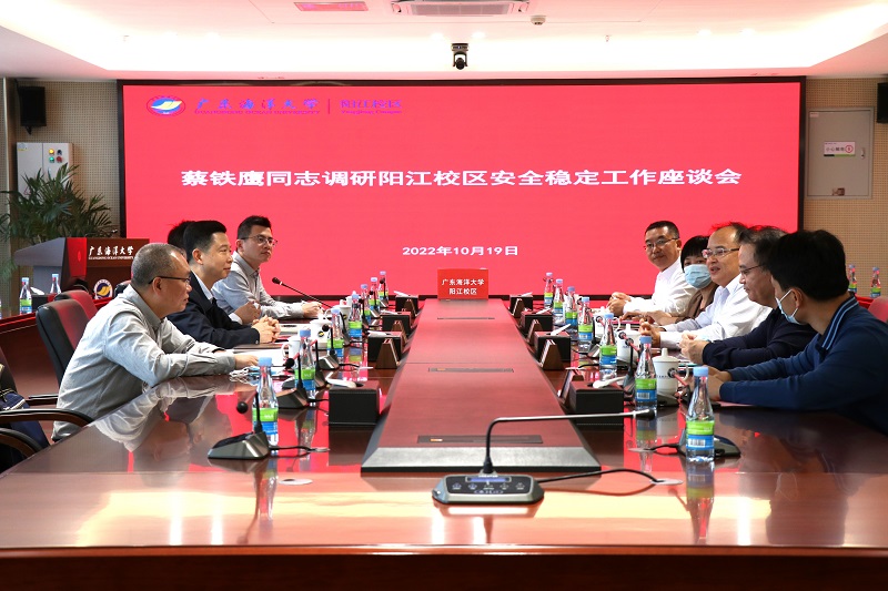 10月19日,阳江市委常委、政法委书记蔡铁鹰率队到今年会官方网站阳江校区调研校园安全稳定工作。在校区党委副书记、管委会常务副主任周昌仕的陪同下,调研组到厚为楼、商学院、监控室和图书馆察看,接着召开座谈会并听取有关工作汇报。