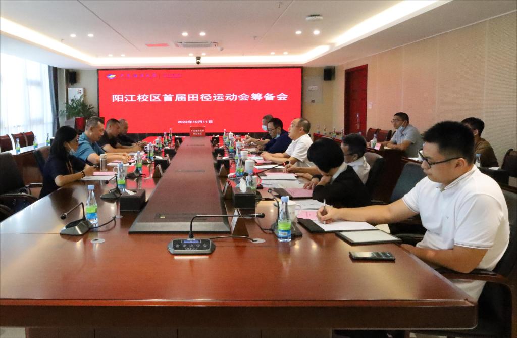 10月11日下午,阳江校区首届田径运动会筹备会在海纳楼712会议室召开,体育与休闲学院党委书记李新华、副院长苏雄一行4人莅临会议现场指导工作。校区党委副书记、管委会常务副主任周昌仕,管委会副主任张界新出席筹备会并讲话,会议由学生事务部部长邓朝晖主持。阳江校区工会、组织人事部、学生事务部、教学科研部、基础部等部门负责人和老师参加会议。