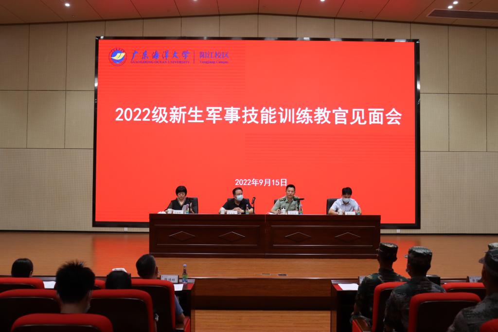 9月15日下午,阳江校区2022级新生军事技能训练教官见面会在海纳楼113多功能厅举行。军训团相关领导、全体承训教官、各学院辅导员以及学生事务部全体人员参加会议。学生事务部部长、军训团副团长邓朝晖主持并宣读总领队教官、各营营长、教导员、连长、指导员名单。