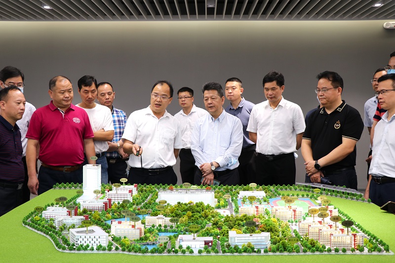 调研组一行首先来到校区厚为楼16楼展厅,通过校园沙盘察看校园地理分布和整体建设情况。随后实地参观校区,并在海纳楼712会议室召开座谈会。周昌仕汇报了阳江校区建设以及校园安全保卫工作情况。