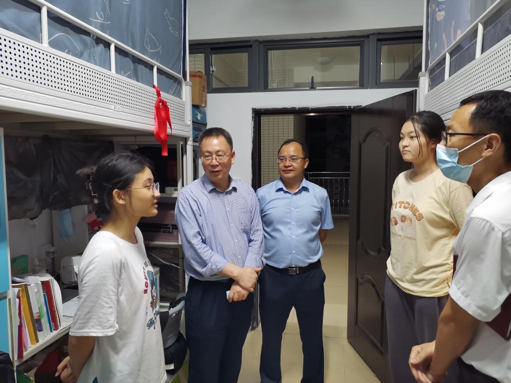 5月24日下午,学校党委副书记、纪委书记彭权群在阳江校区领导周昌仕、毛琪、李鹏虹的陪同下深入饭堂、学生宿舍看望学生。