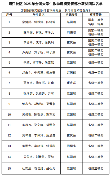 11月1日,根据全国大学生数学建模竞赛组委会发布消息,阳江校区学子在2025年“高教社杯”全国大学生数学建模竞赛中荣获全国一等奖2项、全国二等奖2项、省级一等奖7项、省级二等奖6项、省级三等奖11项。