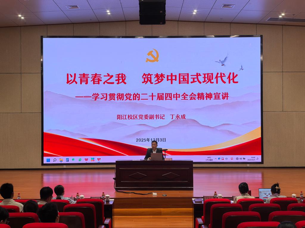 12月3日下午,阳江校区党委分党校在海纳楼113报告厅举行2025年第2期入党积极分子培训班开班式。校区党委副书记丁永成作开班动员暨学习贯彻党的二十届四中全会精神宣讲,校区党委委员、管理办公室副主任、组织人事部部长刘波主持开班式,各学院专兼职组织员及120名入党积极分子参加。