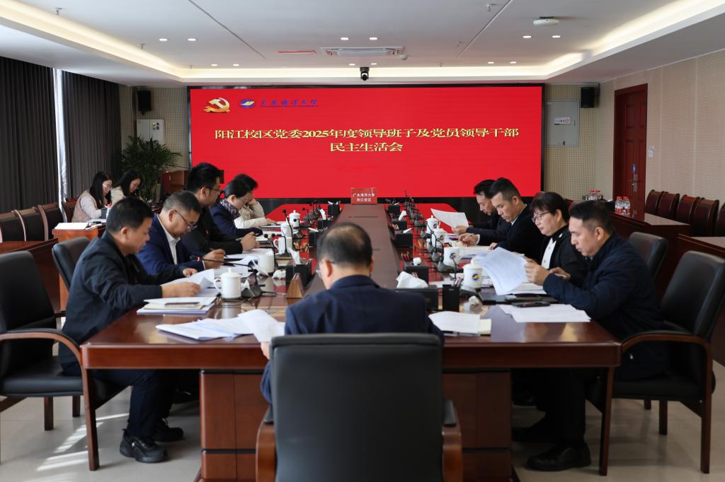 近日,阳江校区党委在海纳楼712会议室召开2025年度领导班子和党员干部民主生活会,深入学习贯彻习近平新时代中国特色社会主义思想,全面贯彻党的二十届四中全会精神,锲而不舍落实中央八项规定精神,推进作风建设常态化长效化,结合思想和工作实际进行自我检视、党性分析,开展批评和自我批评。学校党委常委、副校长,校区党委书记、管理办公室主任周昌仕主持会议,校区党委领导班子成员丁永成、麦冬宁、张家荣、刘波、白浚宇、孙学甫参加会议,有关部门负责人列席会议。