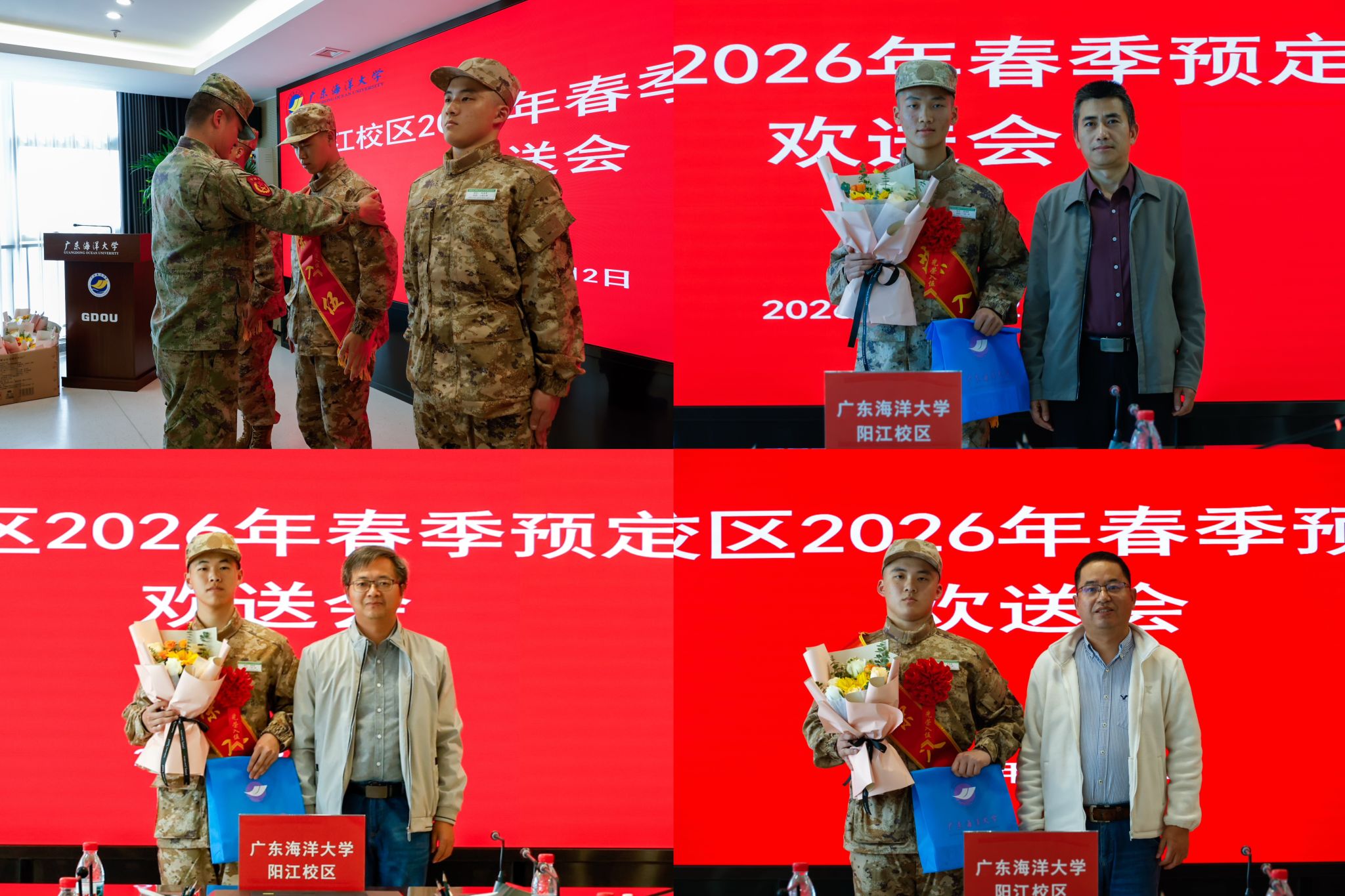 会上,阳东区人武部教练员陈英博为三位预定新兵佩戴红花、绶带,郑海明、李毅、杨新河分别为相应学院的预定新兵赠送鲜花、颁发纪念品,丁永成为学生家长代表赠送鲜花,向默默支持子女参军报国的家长们致以诚挚感谢。