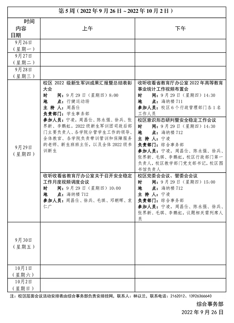 2022~2023学年第一学期第05周会议活动安排表