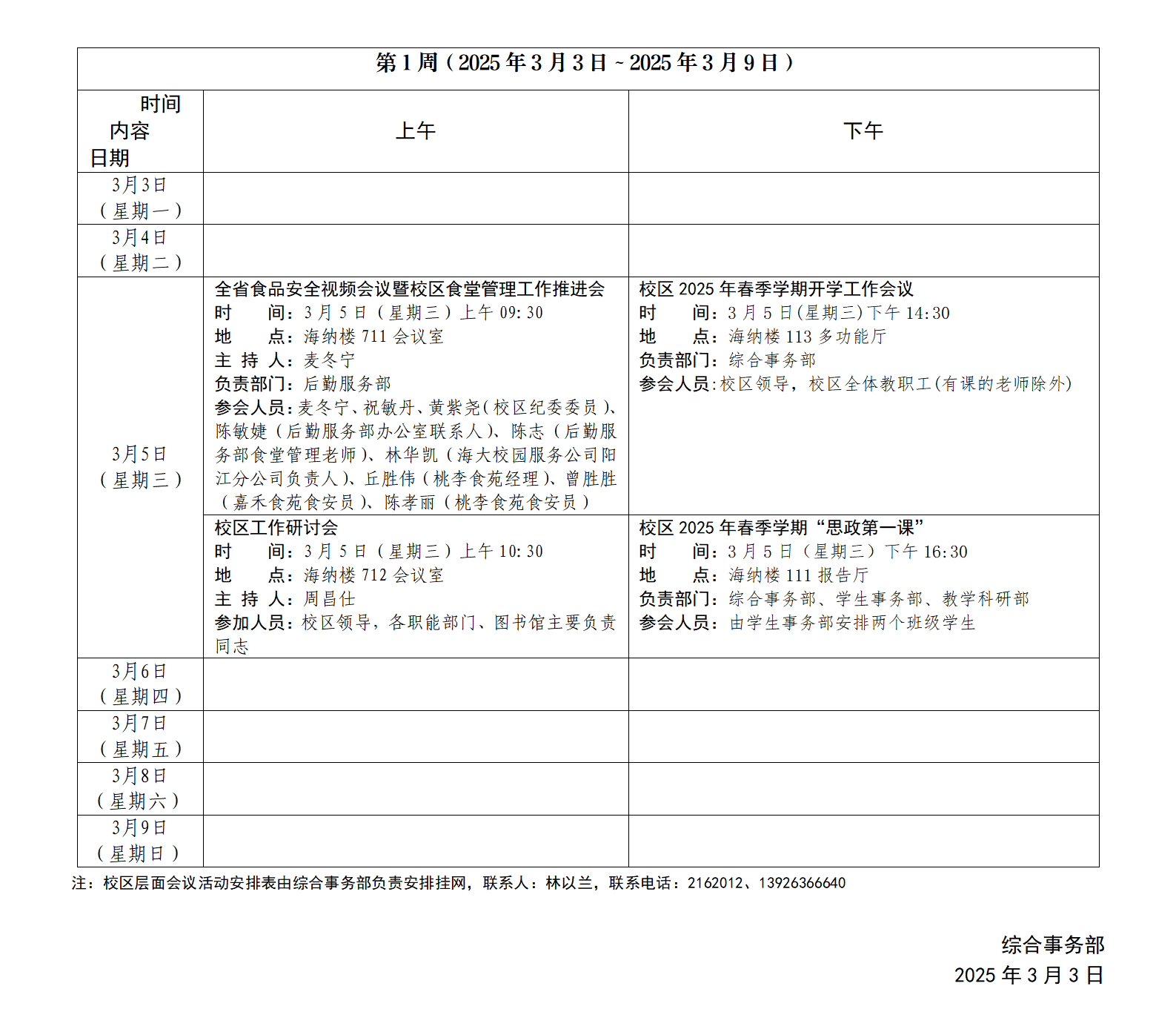 2024~2025学年第二学期第1周会议活动安排表