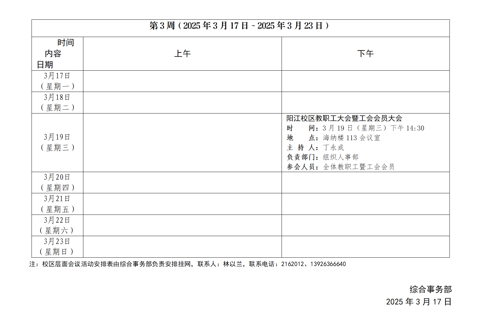 2024~2025学年第二学期第3周会议活动安排表