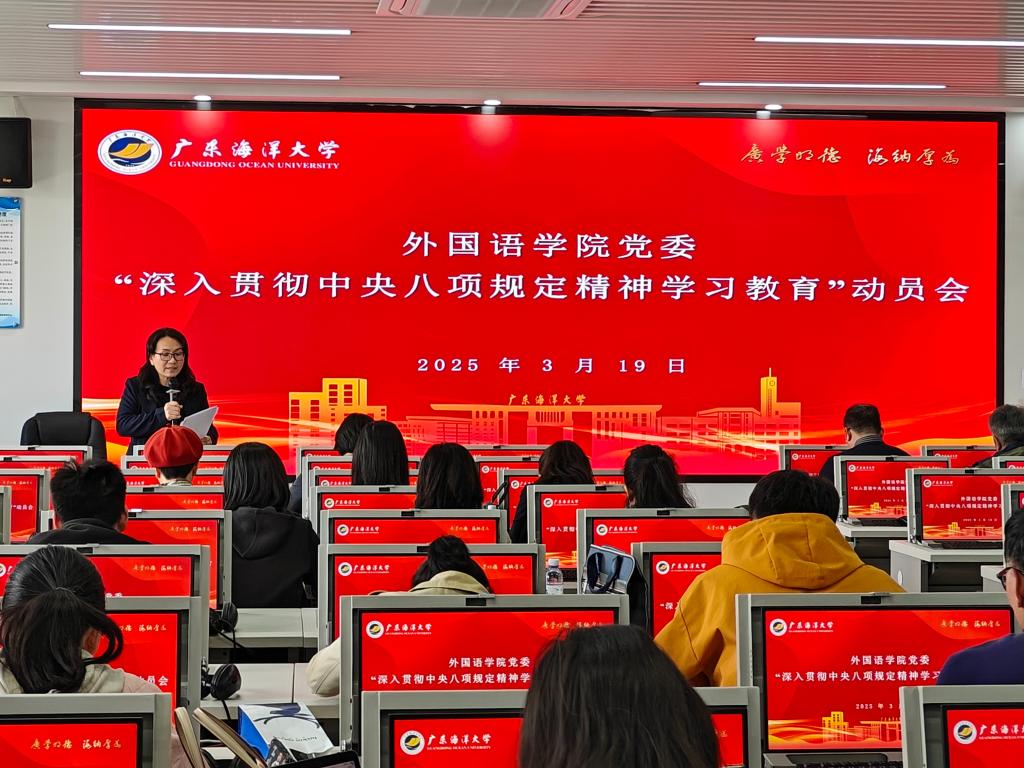 3月19日下午,外国语学院党委在文科2号楼704教室举行深入贯彻中央八项规定精神学习教育动员会。学院领导班子成员、党委委员、纪委委员、各党支部书记及全体教职工共计65人参加了会议,会议由学院党委书记刘艳主持。