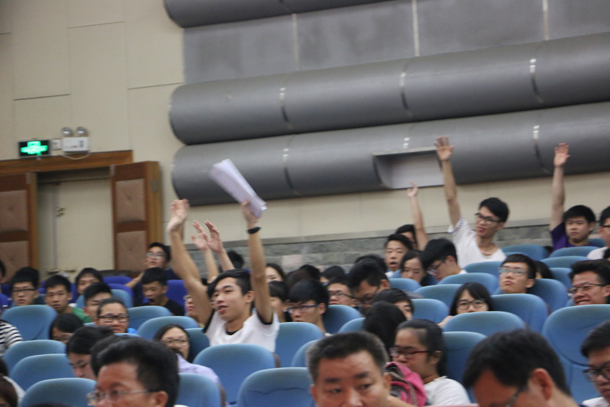 随后,学生代表踊跃举手提问,现场提了32条问题,内容涉及考研、管理服务人员工作态度和效率、教学设备设施维修、体育场所管理、校园卫生保洁、校园网络、环校车管理、勤工助学、学生公寓安装空调及热水供应等方面。叶春海校长及相关职能部门、学院的负责人一一给予耐心的答复和贴心的承诺;对需进一步调查落实的问题,叶春海校长要求相关部门会后拿出方案、抓紧解决。活动进行近2小时,现场气氛热烈,学生热情参与。