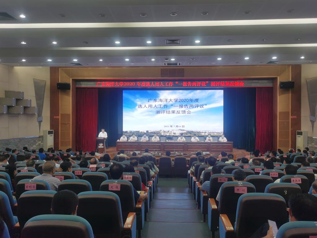 7月16日上午,学校在湖光校区主教学楼多功能厅召开2020年度选人用人工作“一报告两评议”结果反馈会。学校党委书记曹俊明主持会议,校长潘新祥和其他党委常委与处级(含相当)干部,以及当时对2020年度学校选人用人工作“一报告两评议”进行测评的“一代表两委员”和“双代会”代表及基层党员干部代表等参加会议。