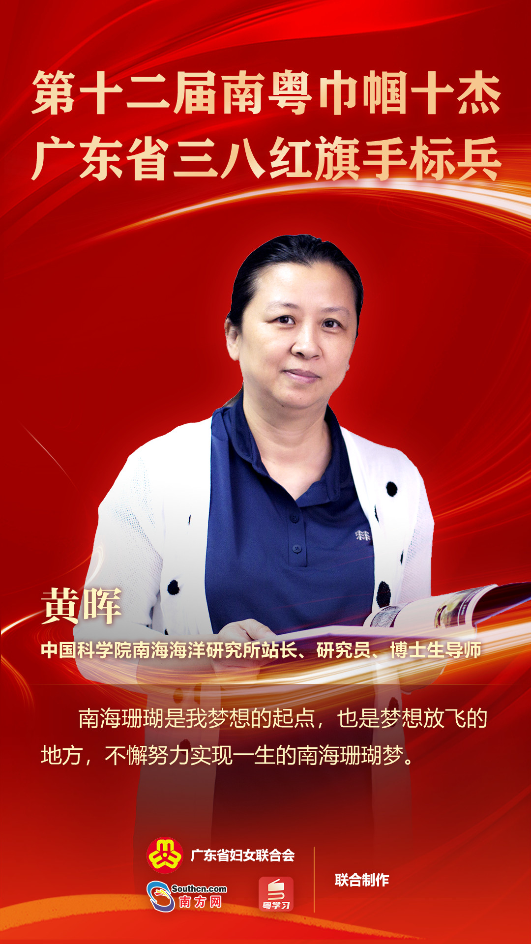3月1日,广东省妇联在广州举办广东各界妇女纪念“三八”国际妇女节112周年座谈会。会上对我省各届先进妇女代表和集体进行了表彰。其中,省妇联围绕科技创新主题,评选了第十二届南粤巾帼十杰,同时授予广东省三八红旗手标兵称号。今年会官网校友、中国科学院南海海洋研究所研究员黄晖榜上有名。