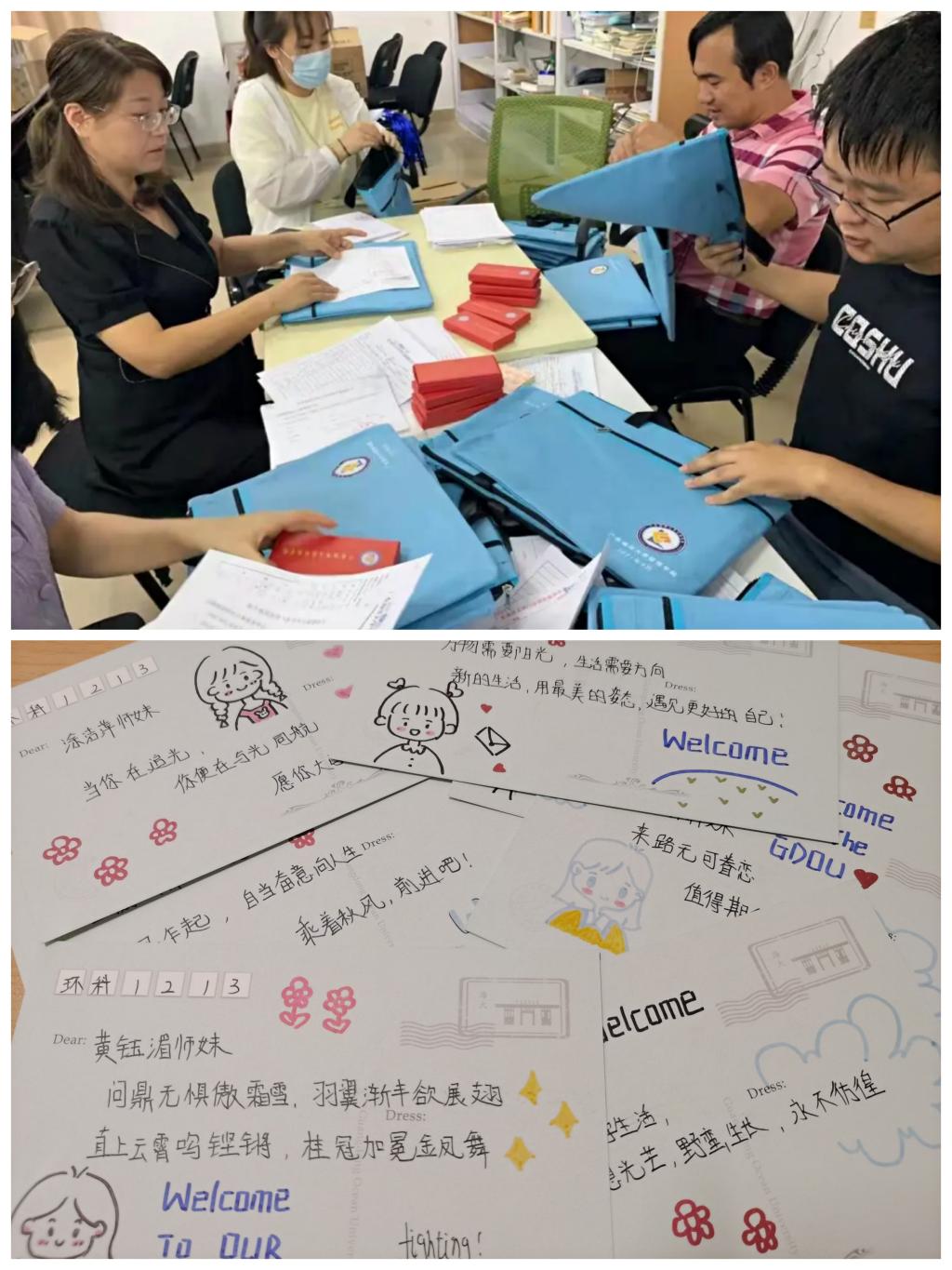 为彰显迎新工作的人文关怀,学院各出奇招,向新生们送上别出心裁的“见面礼”:管理学院为新生定制含精美钥匙扣、团学宣传册、新生纪念册、定制资料袋等礼品及相关资料的新生大礼包;化学院环境学院提前准备好明信片,新生班助们手写了494份暖心寄语,分别送给每位新生;中歌艺术学院为了弥补新生家长不能进校的遗憾,特意开通实时直播,让家长放心,同学安心。