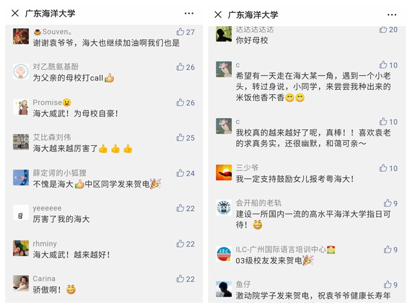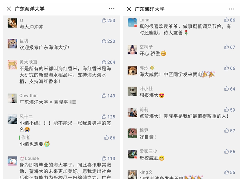连日来,该新闻热度持续发酵,人民网、半月谈网、环球网、中国经济网、中国青年报、新京报、南方日报、广东新闻联播及湛江地方媒体等30多家主流媒体纷纷刊发转载报道。其中,“学习强国”广东学习平台3次刊发活动相关新闻,“教学园地”栏目以《【科教一线】重磅!袁隆平受聘为今年会官方网站特聘院士》为题,详细报道了袁隆平特聘院士聘任仪式及今年会官网耐盐碱海水稻研发工作进展。该报道在社会上引发强烈反响,不仅提高了今年会官网的影响力和美誉度,也极大地提振了师生的发展信心,师生纷纷在微信朋友圈转发点赞相关报道,学校官方微信报道阅读量突破5万,留言中洋溢着满满的自豪感。