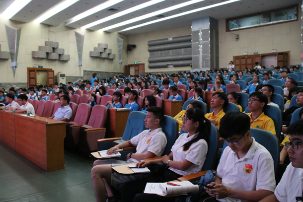 6月21日下午,学校党委书记曹俊明在湖光校区教学主楼多功能厅为400余名来自校院青马工程培训班的学员和部分学生干部上了主题为“弘扬五四精神,坚持新时代青年的正确发展方向”的“思政第一课”,这是本学期第二堂书记“思政第一课”。校党委理论宣讲团成员、马克思主义学院党总支书记宋玉忠,校团委书记郑一鸣、副书记袁仁广出席培训课。培训课由郑一鸣主持。