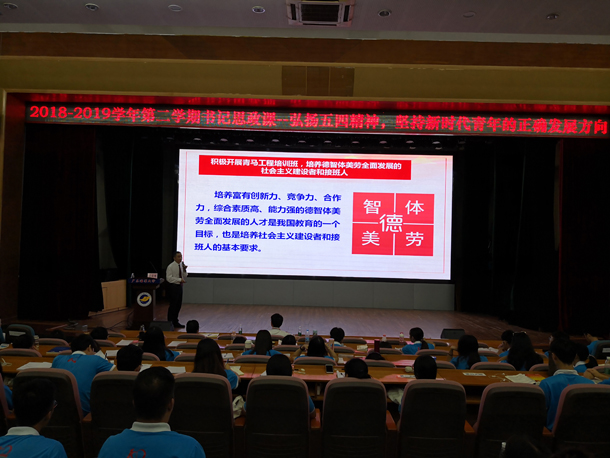 曹俊明详细阐释了习近平总书记在纪念五四运动100周年大会上重要讲话中对青年提出的“树立远大理想”“热爱伟大祖国”“担当时代责任”“勇于砥砺奋斗”“练就过硬本领”“锤炼品德修为”六点要求并指出:青年理想远大是一个国家无坚不摧的伟大动力,热爱祖国是每个青年学子的立身之本、成才之基。他要求同学们珍惜这个时代、担负时代使命;自觉树立和践行社会主义核心价值观,勇立时代潮头,做走在时代前列的奋进者、开拓者、奉献者;不断增强学习紧迫感,如饥似渴、孜孜不倦地学习。