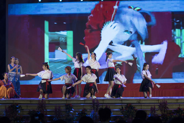模特表演《衣舞飞扬》时而清新优雅,时而热烈奔放;维吾尔族、傣族、蒙古族、藏族的同学的民族舞串烧《祖国大家庭》展现了各民族大融合的盛世景象。