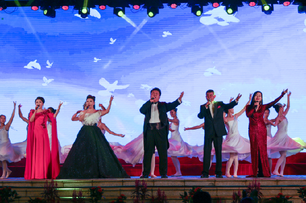 晚会在《祖国我为你干杯》歌声中渐入尾声,最后全体演员齐唱《远方的朋友请你留下来》。