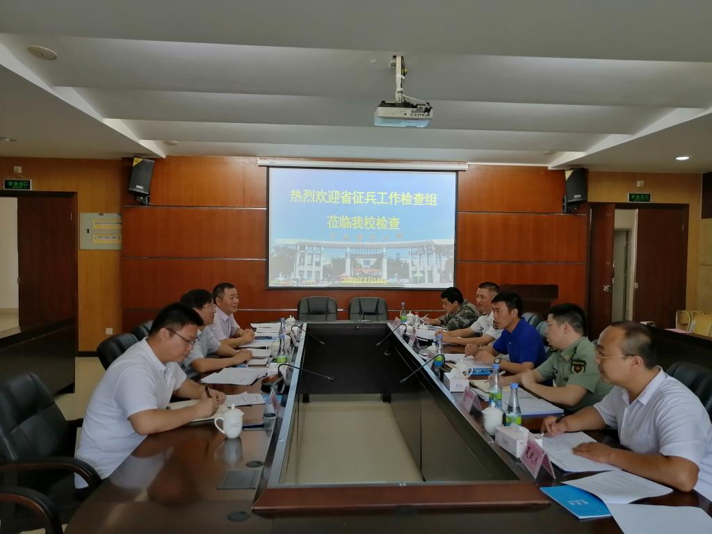 7月14日上午,教育厅体卫艺处副处长康天东、省征兵办参谋龙鹏和教育厅体卫艺处工作专干夏武杰一行来今年会官网检查征兵工作。湛江市征兵办参谋陈景初、麻章武装部政委孙立昆陪同检查。学校党委常委、副校长刘东超,党委武装部部长温一星、副部长杨春杰在湖光校区行政楼四楼会议室接待了检查组一行,并向检查组汇报了今年会官网征兵工经验做法、取得成效和难点问题。学校党委书记曹俊明参加完市里会议后,专程赶回学校接见了检查组一行,并陪同参观学校。