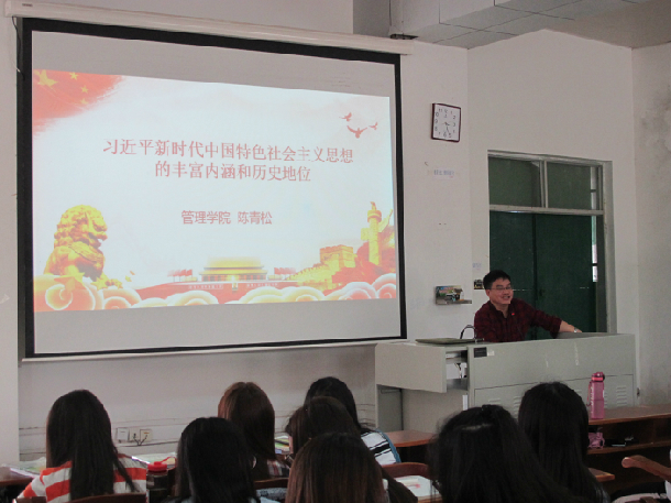陈青松副教授为学生作了题为《习近平新时代中国特色社会主义思想的丰富内涵和历史地位》的讲课。首先阐述了习近平新时代中国特色社会主义思想产生的社会背景。随后讲解了习近平新时代中国特色社会主义思想的丰富内容,重点介绍了新时代中国特色社会主义思想中的“八大明确”和基本方略。最后阐明了习近平新时代中国特色社会主义思想历史地位,一是在理论上实现了马克思主义中国化的新飞跃;二是在实践上形成了治国理政的总体框架;三是在话语体系上构建中国特色哲学社会科学新话语;四是在文化上为解决人类问题贡献了中华新文明。