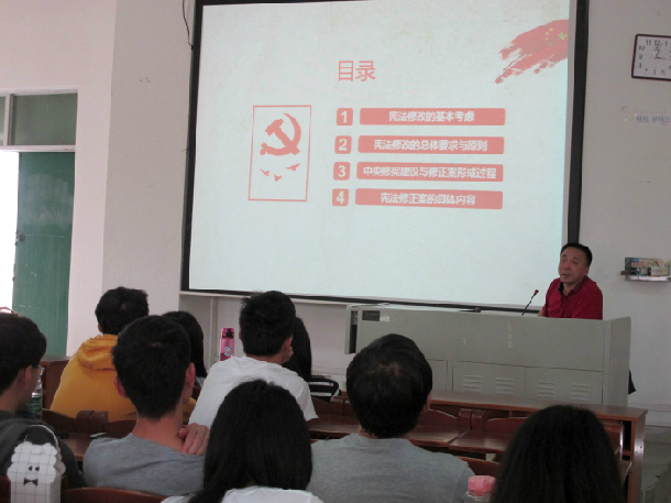宁凌教授为学生作了题为《国家< 宪法>修订情况宣讲》的讲课。宁凌教授首先向学生介绍了自己作为人大代表履职的经历,阐述了人大代表的职责,分享了自己参加全国人民代表大会的体会,特别是国家主席习近平进行宪法宣誓的感动瞬间。坦言作为人大代表是幸运的、幸福的,也是感恩的。然后,宁凌教授对国家《宪法》修订情况进行宣讲。详细讲解了宪法修改的基本考虑、宪法修改的总体要求与原则、中央修宪建议与修正案形成过程、宪法修正案的具体内容,指出《宪法》修订把党的指导思想转化为国家指导思想,是党和国家事业发展的迫切需要,也是我国宪法完善发展的内在要求;《宪法》修订进一步明确坚持党对一切工作的领导这一最高政治原则,有利于巩固党的执政地位和执政基础、为国家发展和民族振兴提供坚强政治保证。