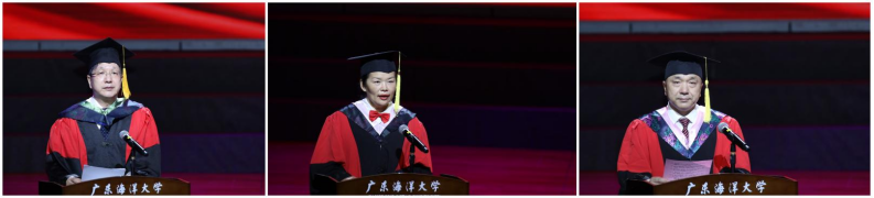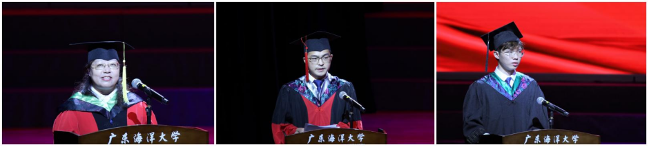 滨海农业学院吴刘萍教授、海洋与气象学院博士毕业生涂石飞、水产学院养殖卓越1181班潘铧康分别作为教师、研究生和本科毕业生代表发言。吴刘萍寄语毕业生,以“广学明德、海纳厚为”校训为指引,携带“为人民谋福祉”的海大基因,胸怀青春志气和璀璨梦想,披荆斩棘,在更广阔的天地间成长为大写的“海大人”。涂石飞深情回顾了在海大就读本硕博十年的点滴,感恩母校的悉心培养,致谢师长的亲切关怀,表示自己将谨记海大校训,传承海大精神,争做走在时代前列的奋进者、开拓者、奉献者,为母校争光添彩。潘铧康分享了大学四年的收获和感悟,感恩海大为其提供了一个奋斗驿站和公平展示自我的平台,并以“相信自己,迎难而上,努力奋斗成为会发光的‘金子’”与毕业生们共勉。