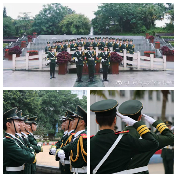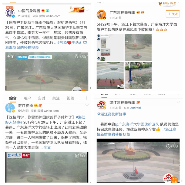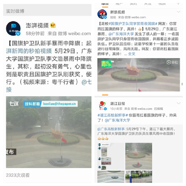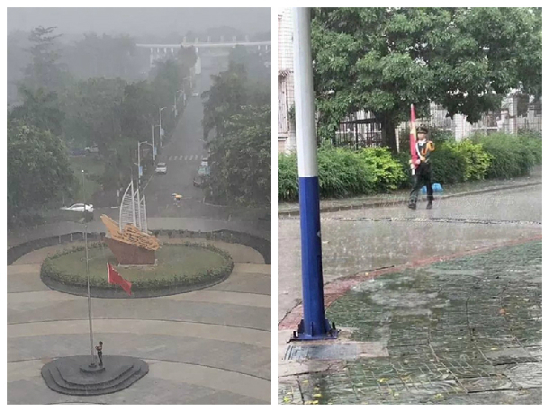 5月29日下午,湛江多地发布暴雨黄色预警,湖光校区暴雨如注,一位国旗护卫队的队员冒着大雨,毅然走向升旗台把国旗收了下来,并扛着国旗踢着正步返回宿舍。这感人的一幕刚好被站在教学主楼办公室窗口的文学与新闻传播学院的陈灵婧、龙黎飞老师看到了,连忙拿出手机拍下视频并发布在朋友圈,当即便引来许多人关注和点赞,在《深圳商报》和澎湃新闻就职的校友闻讯迅速对此事进行了报道。30日下午,人民日报微博也发布消息为冒雨收回国旗的同学高调点赞。