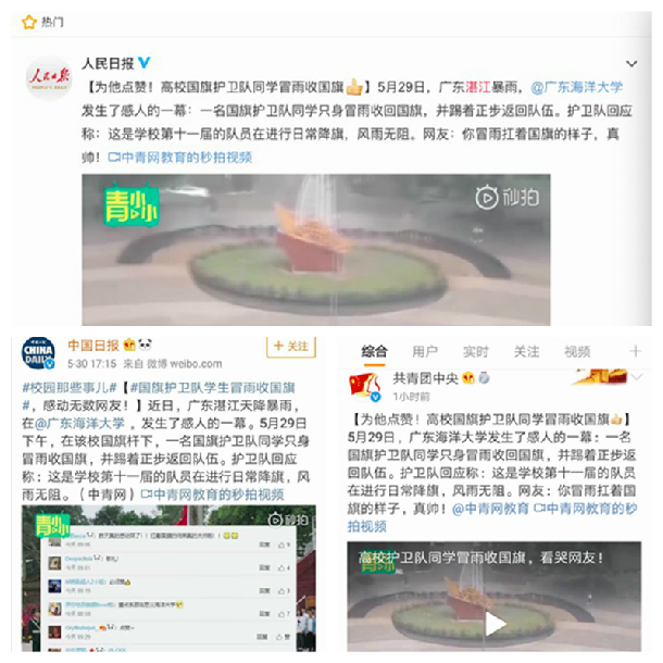 这两天,很多人的微博、朋友圈被一股“今年会官方网站国旗护卫队队员冒雨收国旗”的正能量刷屏,人民日报、中国日报、CCTV等着我、共青团中央、中青网教育等多家微博平台纷纷报道点赞,网友看到现场视频和图片后争相转发并激情评论:“你冒雨扛着国旗的样子,真帅!”