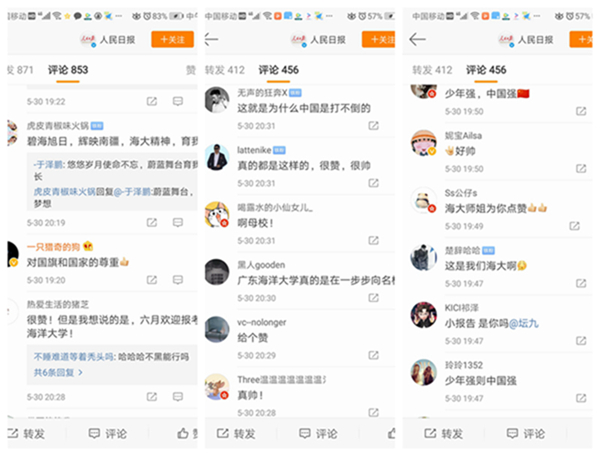 很多校友和在校学生在微博下为自己的母校疯狂打call,抒发自豪和感慨。“这是我的母校!当年我们还是第五届应聘队员,现在已经十一届了!”“海大的骄傲!”“身为一名海大人,倍感自豪!”“海大,充满回忆的地方。即将毕业,万分不舍。”更有同学干脆吟唱起海大校歌。“广学明德立海志,海纳厚为谱宏章。”“悠悠岁月使命不忘,蔚蓝舞台育我成长。”“风正帆悬涛声起,乘风破浪向前方,向前方!”