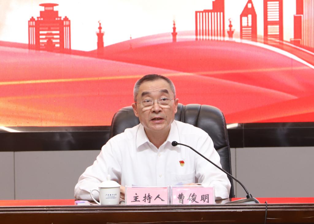 6月13日,学校在湖光校区教学主楼多功能厅召开学校党委理论学习中心组(扩大)会议,学习贯彻广东省第十三次党代会精神,这也是学校省第十三次党代会精神专题培训班首场培训学习。省第十三次党代会精神省委宣讲团成员、省社科院党组副书记、院长王廷惠教授作了题为《奋进新征程 创造新辉煌 建功新时代》的宣讲报告。学校党委书记曹俊明主持会议并讲话。