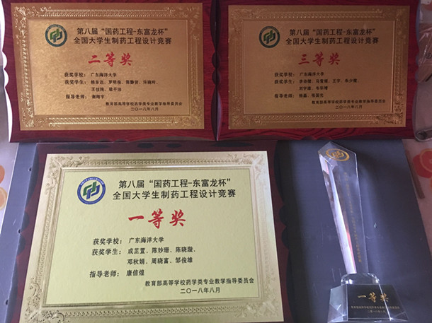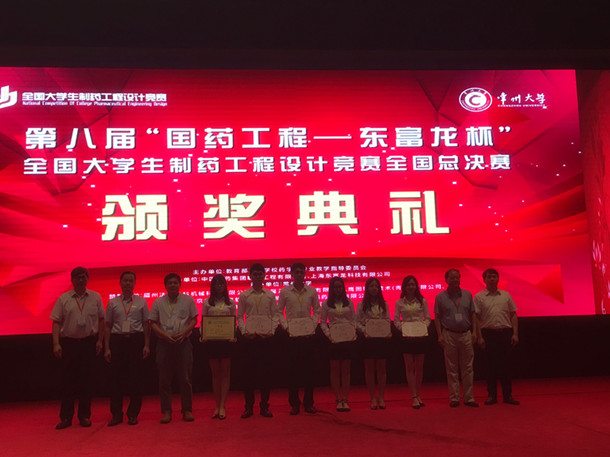 由教育部高等学校药学类专业教学指导委员会主办、中国医药集团联合工程有限公司与上海东富龙科技股份有限公司共同协办、常州大学承办的第八届“国药工程-东富龙杯”全国大学生制药工程设计竞赛在常州举行。今年会官网三支参赛队伍分别荣获全国一等奖,二等奖,三等奖,再创佳绩,在整个广东省的所有参赛队伍中排第一名。