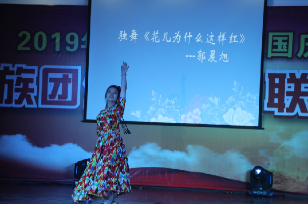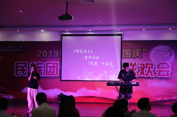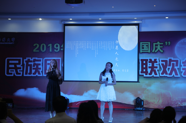 联欢会在《但愿人长久》的歌声中拉开序幕,乐器弹唱《呼吸决定》、配乐诗朗诵《她是祖国母亲》、独舞《花儿为什么红》、哈萨克语歌曲《离别亦思念》等文艺节目亮点纷呈,同时穿插猜灯谜、国史校史抢答、击鼓传月饼等互动游戏环节,现场气氛热烈。整台联欢会演绎了中华民族大团结的温馨场面,表达了向祖国70周年华诞献礼的主题。活动结尾,全体师生挥舞手中的国旗放声高唱《我和我的祖国》,把联欢活动推向高潮。