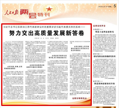 3月5日下午,习近平总书记在参加十四届全国人大一次会议江苏代表团审议时强调,高质量发展是全面建设社会主义现代化国家的首要任务,必须完整、准确、全面贯彻新发展理念,始终以创新、协调、绿色、开放、共享的内在统一来把握发展、衡量发展、推动发展。
