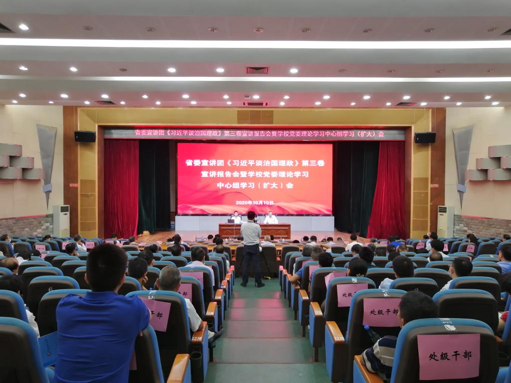 10月10日上午,学校在湖光校区教学主楼多功能厅举行省委宣讲团《习近平谈治国理政》第三卷宣讲报告会暨党委理论学习中心组学习(扩大)会,党委书记曹俊明主持报告会,广东省社会科学院党组成员、副院长赵细康二级研究员作专题报告。学校领导、党委理论学习中心组全体成员,学校副处级(含相当)及以上干部、党委理论宣讲团成员及党群部门正科级干部等共160余人现场参加报告会,另有900余名师生通过企业微信直播参会。