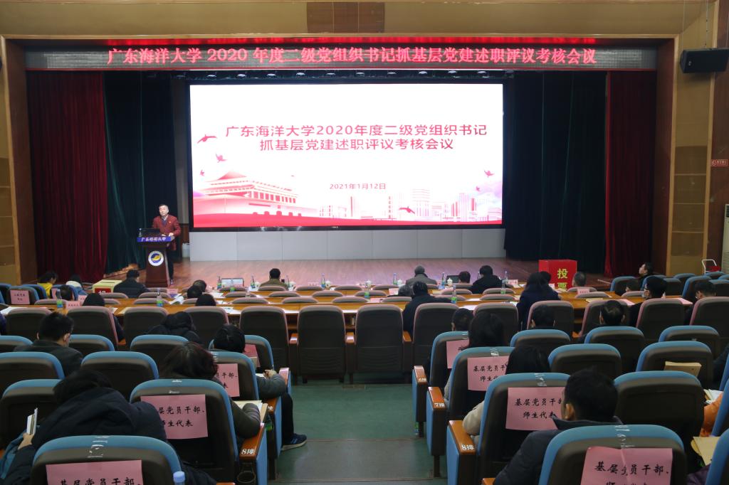 根据省委教育工委关于做好2020年度高校党委书记抓基层党建述职考核评议工作的有关要求,1月12日上午,学校党委在湖光校区教学主楼多功能厅召开2020年度二级党组织书记抓基层党建工作述职评议考核会议。学校党委书记曹俊明主持会议并作点评和总结讲话。学校党委常委,党务部门主要负责人,各二级党组织书记、院长,部分“两代表一委员”、师生代表等87人参加会议并进行现场评议打分。
